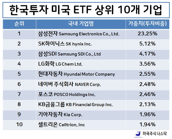 미국 ETF가 투자하는 EWY의 상위 10개 기업을 순위별로 보면 삼성전자(23.25%), SK하이닉스(5.12%), 삼성SDI(4.17%), LG화학(3.56%), 현대자동차(2.55%), 네이버(2.48%), 포스코(2.46%), KB금융그룹(2.13%), 기아자동차(1.96%), 셀트리온(1.94%)이다.
