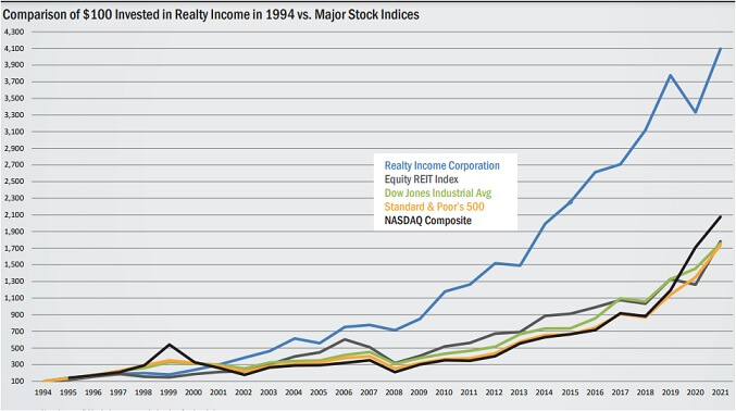 무엇보다 리얼티인컴의 주식은 과거 수익률 데이터에서 타의 추종을 불허한다. 1994년 100달러를 투자했을 경우, 2021년까지의 수익률 비교에서 리얼티인컴(파랑)이 부동산 지수(Equity REIT Index, 연한 검정)를 비롯해 다우존스(연두), S&P500(주황), 나스닥(진한 검정) 등 주요 지수들보다 상승률 면에서 압도적인 우위를 보인다.