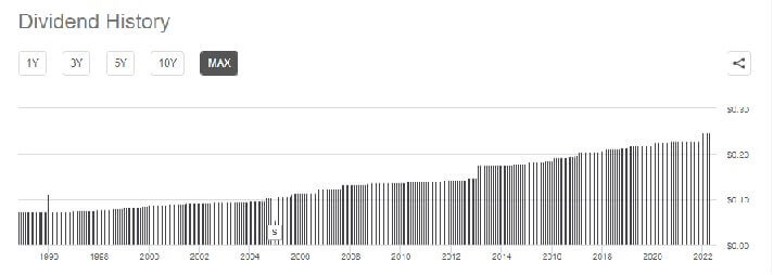 게다가 매월 15일이 배당일인 월 배당 방식이어서 매월 배당금을 수령하게 된다. 주식을 보유해 배당을 받을 수 있는 시점의 날짜를 뜻하는 배당락일은 매월 말일이다. 여타 대부분의 미국기업들은 월 배당이 아닌 분기 배당을 실시하고 있다.