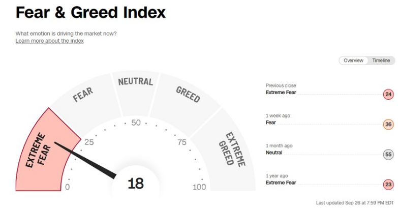 아래 2022년 9월 26일의 공포탐욕지수를 예로 들어보면, 최근 초유의 하락장을 겪고 있는 투자자들의 심리를 대변하듯 극도의 공포(Extreme Fear) 구간에 들어와 있다.