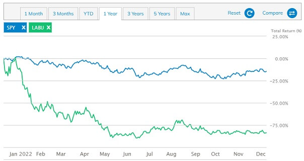 LABU는 미국의 바이오테크놀로지 섹터와 연동하는 3배 레버리지 ETF다. ETF가 3천종을 넘긴 미국에서 ETF 거래량 10위 안에 랭크될 정도로 투자자들에게는 인기를 얻고 있다. 하지만 2022년 LABU의 주가는 70% 이상 하락해 현재는 6달러대까지 내려온 상태다.