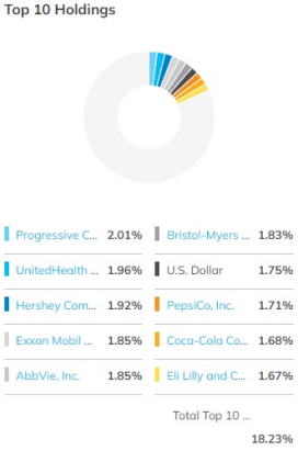 JEPI가 투자하고 있는 상위 10개 기업은 미국 3위 보험사이자 1위 자동차 보험사인 프로그레시브 손해보험사 2.01%, 의료 및 보험 그룹 유나이티드헬스케어 1.96%, 북아메리카 최대 초콜릿 제조업체 허쉬 1.92%, 석유회사 엑손모빌 1.85%, 공개 거래 생체의약품 기업 애브비 1.85%, 뉴욕에 본사를 둔 제약 회사 브리스톨-마이어스 스퀴브 1.83%, 달러(U.S. Dollar) 1.75%, 펩시콜라 1.71%, 코카콜라 1.68%, 제약회사 엘리 릴리 앤 컴퍼니 1.67% 등 총 18.23%이다.