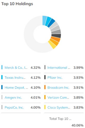 SCHD는 100개 기업에 투자하고 있는데 상위 10개 기업을 살펴보면, 화이자와 함께 세계 최대 제약회사 중 한 곳인 머크앤드컴퍼니 4.32%, 반도체기업인 텍사스 인스트루먼트, 4.12%, 홈디포 4.1%, 세계 1위 유전자 바이오기업 암젠 4.01%, 펩시콜라 4%, IBM 3.99%, 화이자 3.93%, 반도체기업 브로드컴 3.91%, 이동통신사 버라이즌 3.86%, 네트워크 통신 및 보안 서비스 기업 시스코시스템스 3.83% 등 총 40.06%로 다양한 산업군의 배당성장 기업들을 담고 있다. 물론 투자 기업들의 순위와 비중은 다른 ETF들처럼 변동이 있을 수 있다.