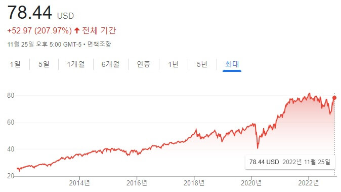 2022년 기준 배당수익률은 연평균 3.79%이나 배당성장률은 5년 평균 12%로 높은 편이다. 이는 그만큼 우량한 배당기업들에 투자를 하고 있기 때문인 것으로 분석된다. 주가 상승률 또한 지난 10년간 매년 평균 13.3%씩 올라 S&P500의 성장률과 유사할 정도인 일명 배당성장주로서의 명성을 쌓아가고 있다.