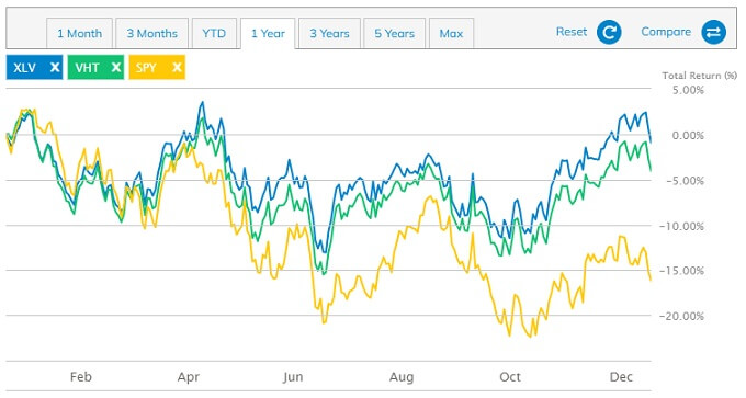 뱅가드의 ETF는 전반적으로 운용수수료가 낮은 것이 특징이다. 스테이트 스트리트도 이에 대항해 수수료를 낮춰 현재는 VHT와 XLV 도두 같은 0.1%다. 배당수익률 역시 둘 다 1%대로, 배당보다는 주가 상승에 포커스를 두어야 할 ETF다.