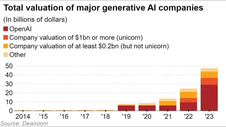 네덜란드에 본사를 둔 데이터 제공업체 딜룸(Dealroom)에 따르면, 2022년 제너레이티브 AI 기업들에 대한 투자는 2020년보다 10배 증가한 21억 달러에 이르며, 2023년 총 기업 가치는 2년 만에 6배 증가한 480억 달러를 기록했다.