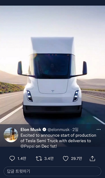 테슬라 CEO 일론 머스크가 트위터를 통해 테슬라가 전기트럭 생산을 시작했으며, 2022년 12월 1일 펩시에 납품할 것이라 밝혔다.