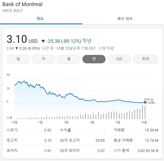 BULZ는 최근 너무도 큰 하락에 일부 투자자들에게 상장폐지 될지도 모른다는 불안감까지 줬었다. 하지만 이는 사실이 아니며 아무리 주가가 낮아지더라도 상폐가 되는 경우는 단 하나인데, 그것은 운용사가 문을 닫을 경우다. 하지만 운용사인 몬트리올 은행이 부도를 내거나 문을 닫을 확률은 매우 낮다.