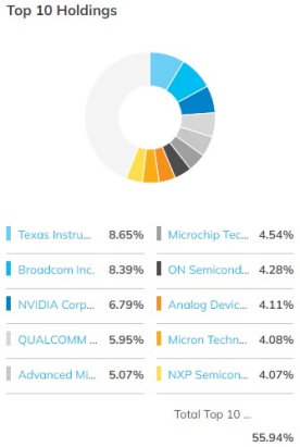 SOXX와 SOXX를 3배 추종하는 SOXL을 구성하고 있는 상위 10개 기업들의 가중치를 순위별로 살펴보면 텍사스 인스트루먼츠 8.85%, 브로드컴 8.39%, 엔비디아 6.79%, 퀄컴 5.95%, AMD 5.07%, 마이크로칩 테크놀러지 4.54%, 온세미 컨덕터 4.28%, 아날로그 디바이스 4.11%, 마이크론 테크놀러지 4.08%, NXP 세미컨덕터 4.07% 등 총 55.94% 비중을 차지하고 있으며, 나머지 25개 기업은 각 4% 이내 가중치를 두고 있다.