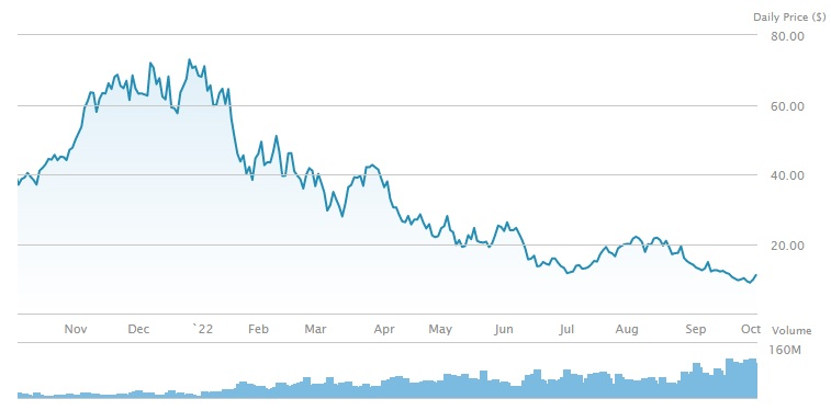 SOXL은 52주 최고가 74.21달러, 최저가 8.74달러인데 2022년 10월 5일 기준 11.42달러로 연중 최저가에 근접해 있다.