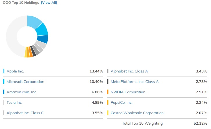QQQ는 시가총액 기준 나스닥 상장 100대 기업으로 구성되는데 이 100대 기업들을 1%씩 동일하게 담는 것이 아니라, 순위별로 투자 가중치를 두기 때문에 상위 10개 기업들이 절반 정도의 비중을 차지한다.