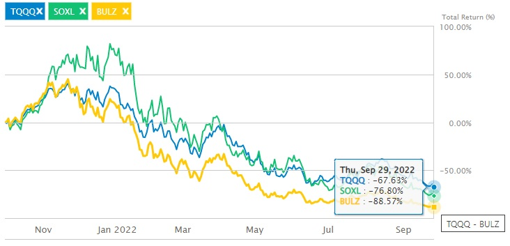 또한 SOXL은 30개 기업, BULZ는 15개 기업이라 100개 기업에 투자하는 TQQQ에 비해 안정성이 떨어진다. 예를 들면 BULZ에 속한 15개 기업 중 최근 넷플릭스와 메타플랫폼스가 특히 성장성과 실적 등에 문제가 있어 BULZ 주가에 적잖은 타격을 입힌 바 있다. 이들 기업은 나스닥100에도 속해 있지만 QQQ에서는 100개 기업 중 일부에 블과하다.